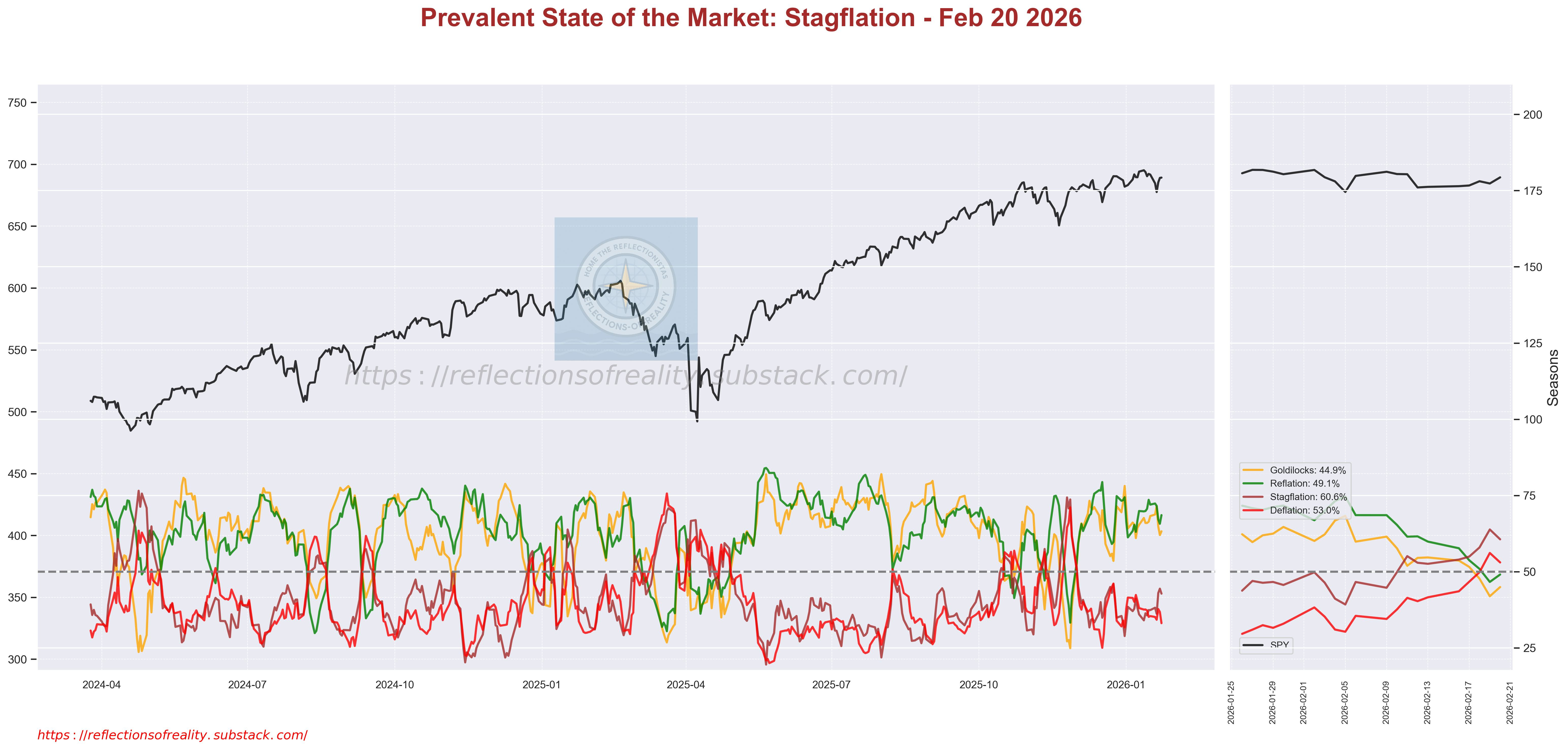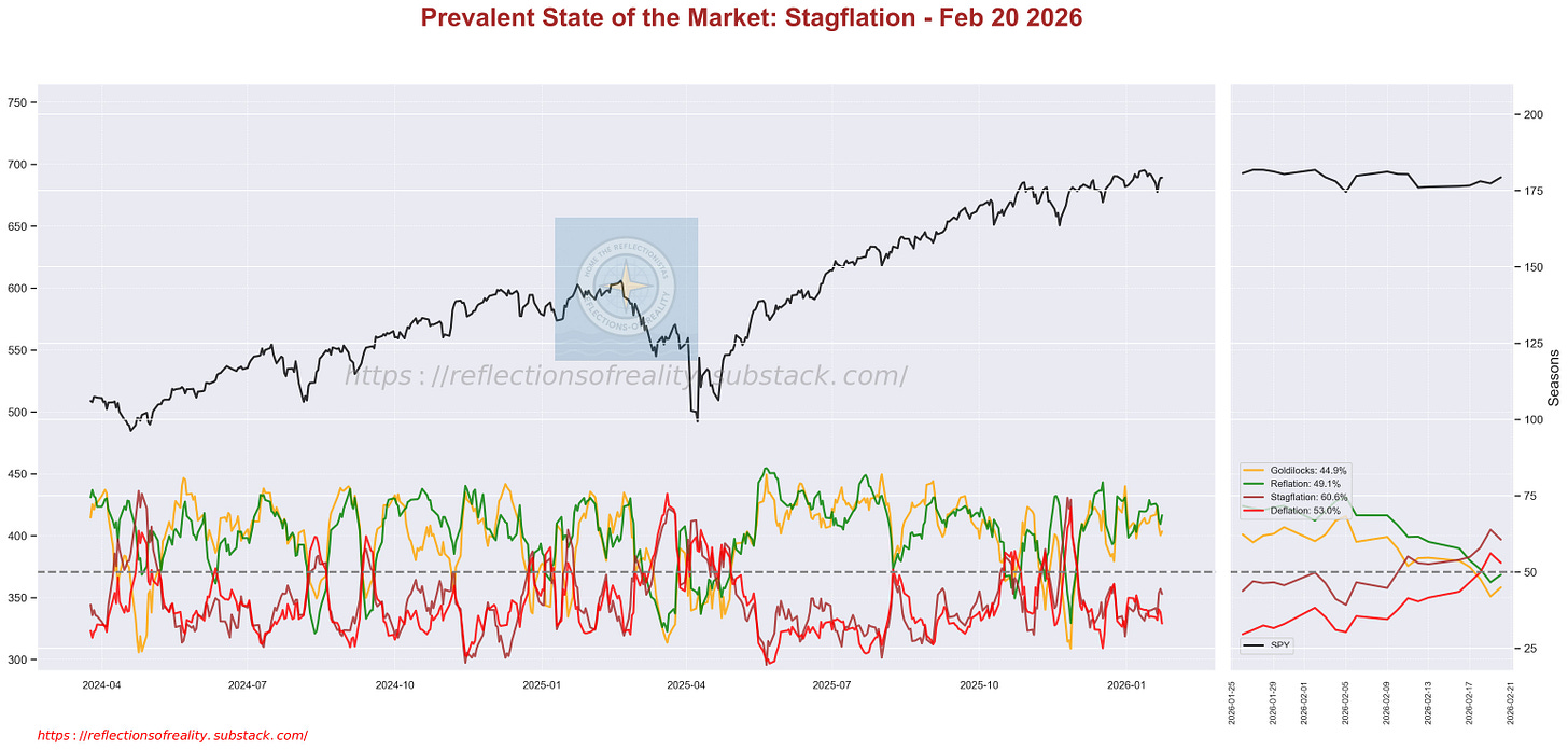 Stagflation 60.6% 🔴 (Deflation 53.0% 🔴) → dominant short-term risk-off with stagflation bias; examples from quadrants include gold and commodities in accumulation. Macro Regimes (Seasons) need to align as well but can lag for a while in a healthy market; divergence = increased risk.
