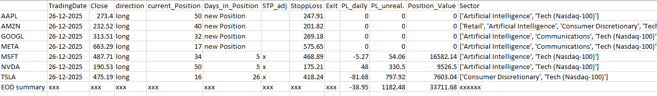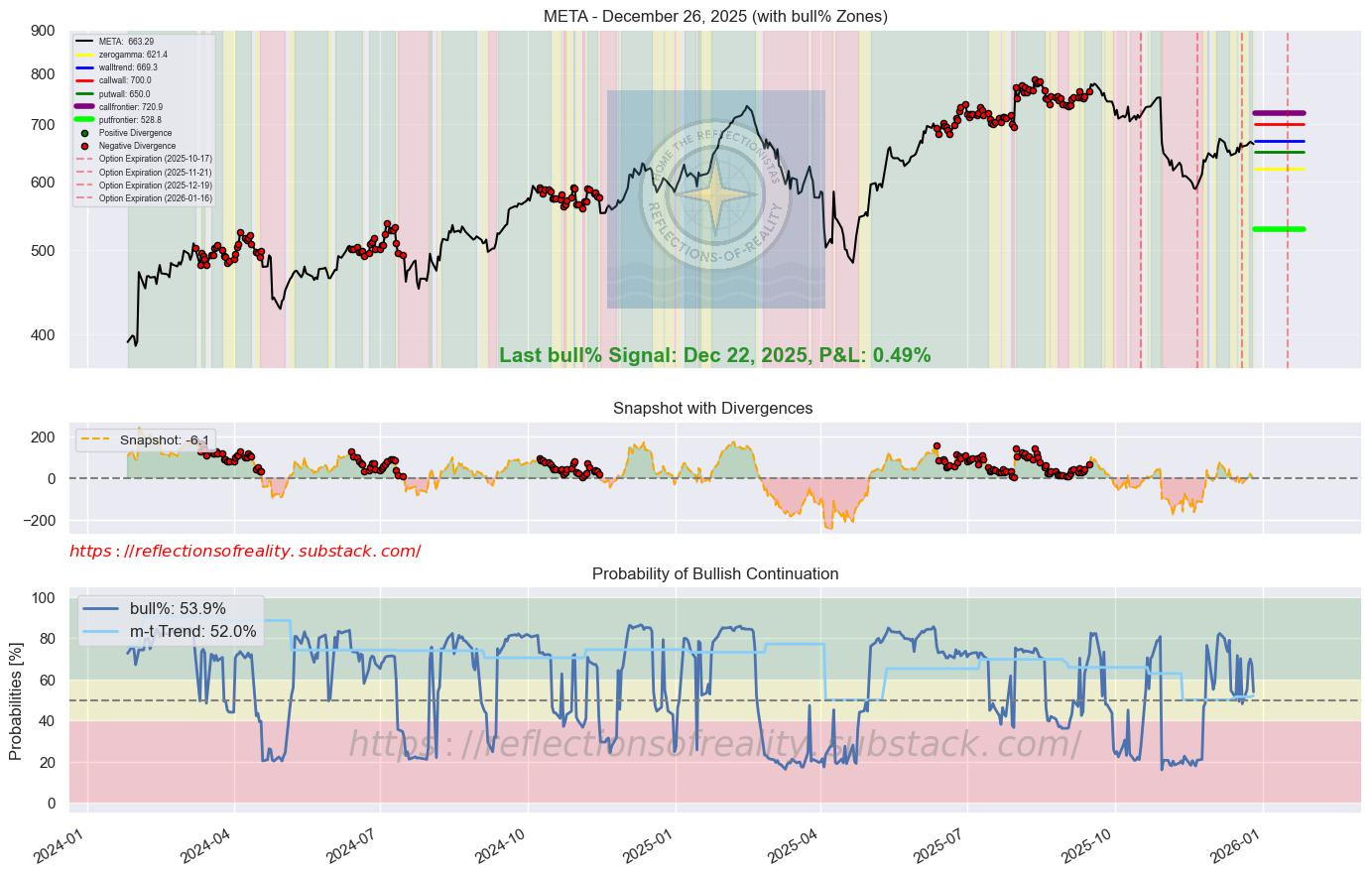 META | 53.9 | -13.1 | [”Beacon1”, “MAGS”] | Meta plans significant budget cuts to its metaverse unit, redirecting resources toward generative AI priorities. Analysts view this as positive for margins and focus on high-growth areas like AI talent and advertising efficiency. The shift supports potential for stock recovery in 2026. (CNBC, 23 Dec 2025)