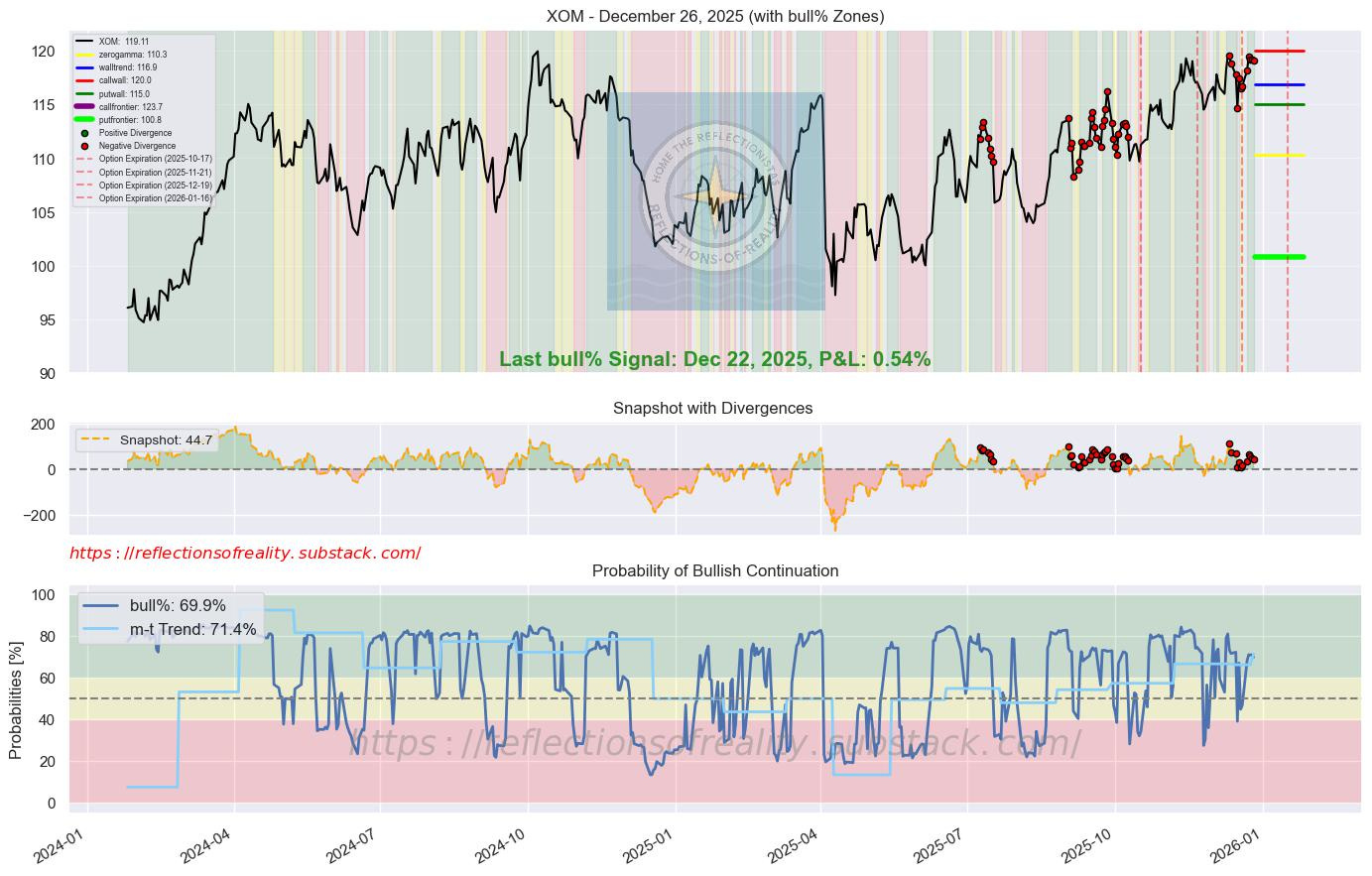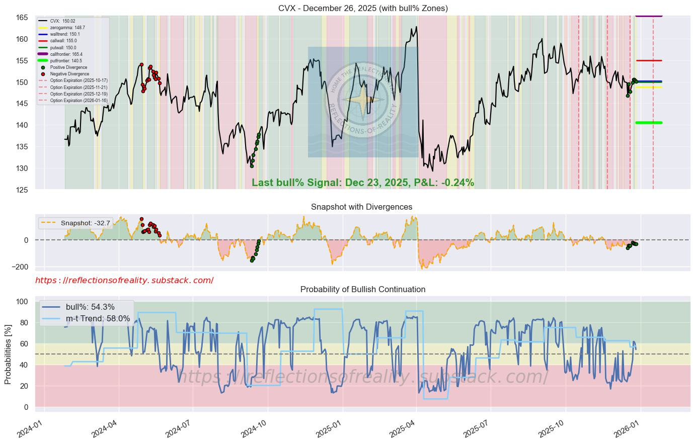 CVX | 54.3 | -5.5 | [’Beacon1’] | Chevron continues operations in Venezuela despite geopolitical risks, maintaining production in key joint ventures. The company’s diversified portfolio and focus on low-cost barrels provide resilience in fluctuating oil markets. Analysts see steady cash flows supporting shareholder returns into 2026. (WSJ/TipRanks, 21 Dec 2025)