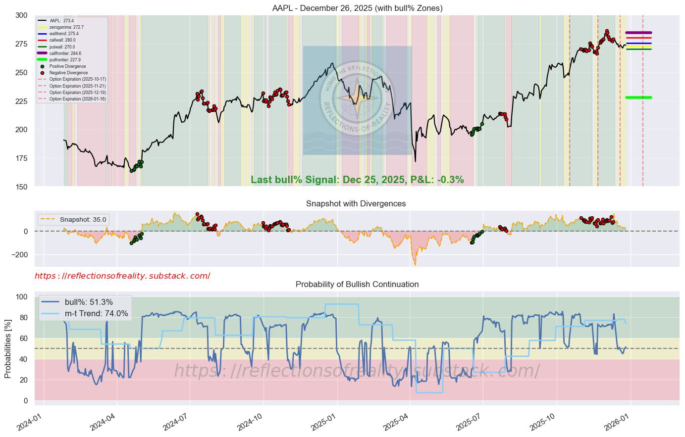 AAPL | 51.3 | +0.9 | [”Beacon1”, “MAGS”] | Apple reclaimed market share in China with a 128% surge in iPhone 17 shipments, driven by strong holiday demand. This performance highlights Apple’s resilient positioning in the premium smartphone segment amid competitive pressures. The gains underscore potential for continued momentum into 2026 as AI features roll out further. (CNBC, 25 Dec 2025)