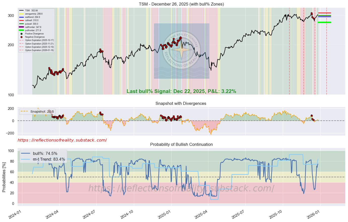 TSM | 74.5 | +1.7 | [’Beacon1’] | Taiwan Semiconductor reported robust capital expenditure approvals and bond issuance, fueling capacity expansion for AI chips. Strong demand from major clients underpins record revenue growth projections. The company’s leading-edge manufacturing dominance positions it for outsized gains in 2026. (TipRanks, 23 Dec 2025)