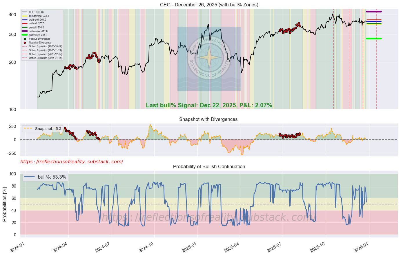 CEG | 53.3 | -16.4 | [’Beacon1’] | Constellation Energy received reaffirmed Buy ratings from analysts including Wells Fargo, citing strong positioning in nuclear power for AI data centers. The company’s clean energy assets benefit from surging electricity demand projections for 2025-2026. This supports potential for elevated valuations amid the AI infrastructure boom. (TipRanks, 22 Dec 2025)