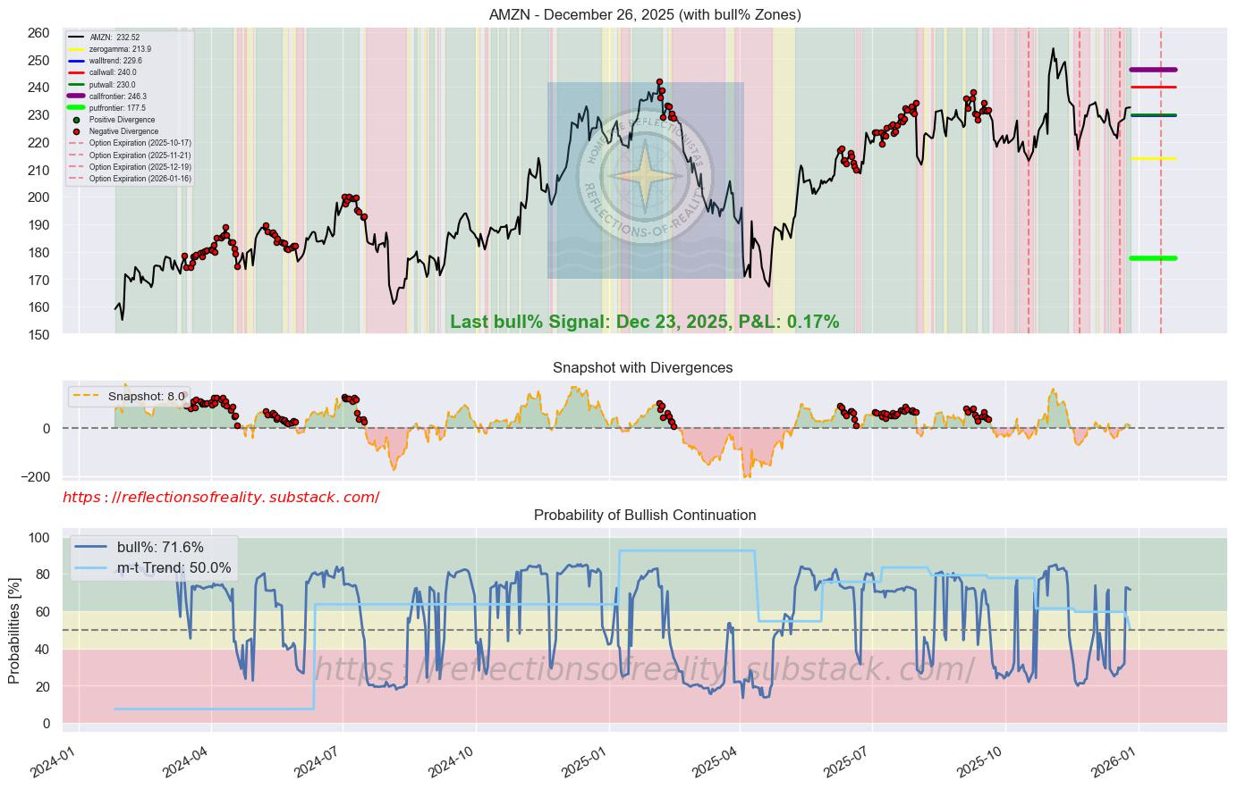 AMZN | 71.6 | -0.3 | [”Beacon1”, “MAGS”] | Amazon is in talks to invest approximately $10 billion in OpenAI, potentially valuing the AI firm over $500 billion. This move would deepen Amazon’s AI capabilities through access to advanced models and chip utilization. It positions AWS for enhanced growth in the competitive cloud and AI infrastructure market. (Reuters, 17 Dec 2025)