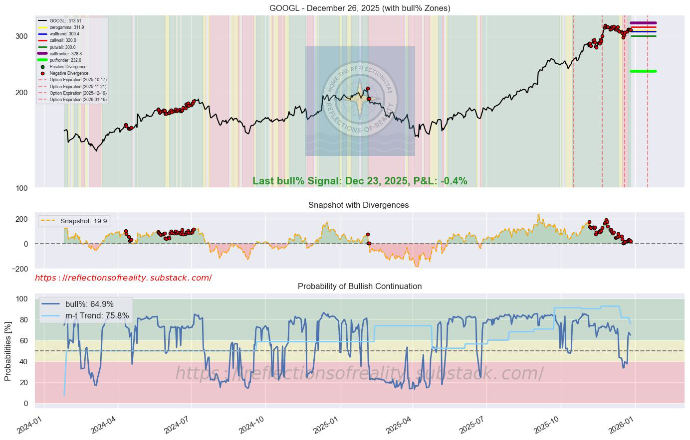 GOOGL | 64.9 | -1.2 | [”Beacon1”, “MAGS”] | Alphabet agreed to acquire data center developer Intersect Power for $4.75 billion to bolster AI infrastructure capacity. The deal enhances Google’s ability to co-locate power generation with hyperscale data centers. It addresses critical energy constraints for continued cloud and AI expansion. (CNBC, 22 Dec 2025)