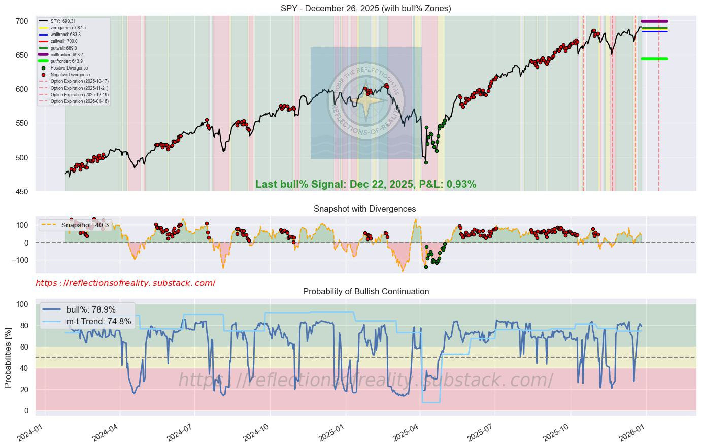 SPY | 78.9 | -1.5 | [’KISS’] | The S&P 500 notched multiple record closes in December amid a broad rally and expectations for continued AI-driven corporate profits. Reduced volatility and seasonal strength contributed to gains despite tariff concerns. Investors anticipate supportive Fed policy sustaining momentum into 2026. (Reuters, 24 Dec 2025)
